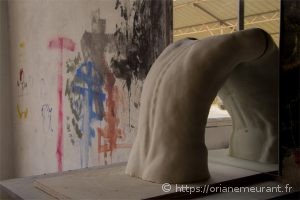 Artisanal ceramic firing in a can White stoneware torso made with coil construction technique, 68x48x30cm
